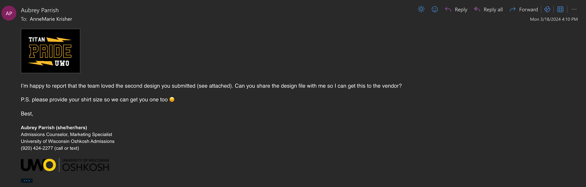 A shirt design for UW Oshkosh that was chosen for admitted student day at Lambeau Field.