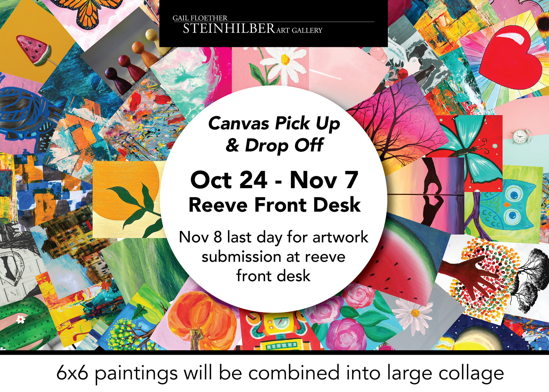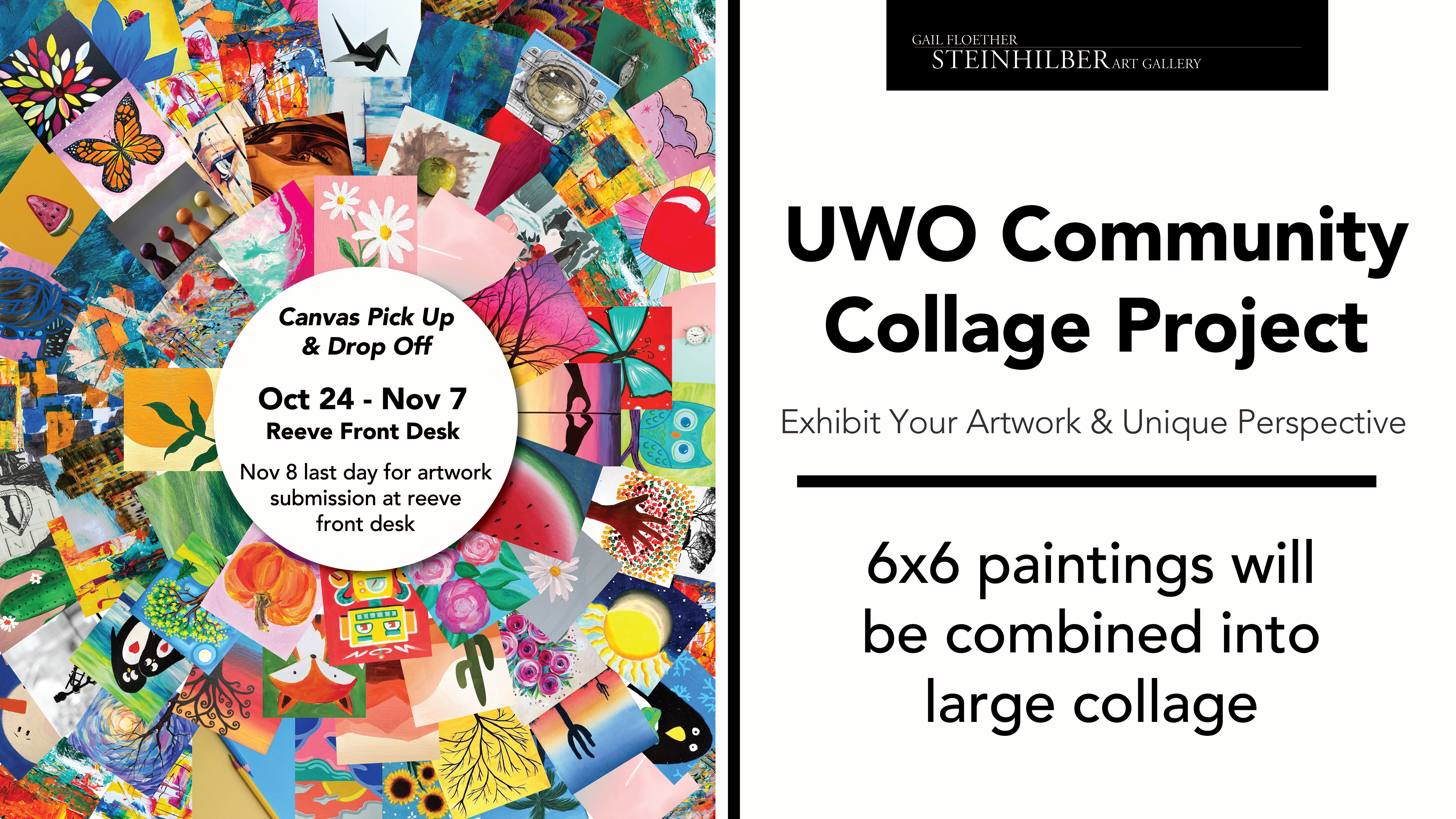 Marketing materials for a community collage project for the Steinhilber Art Gallery inside of Reeve Union at UW Oshkosh.